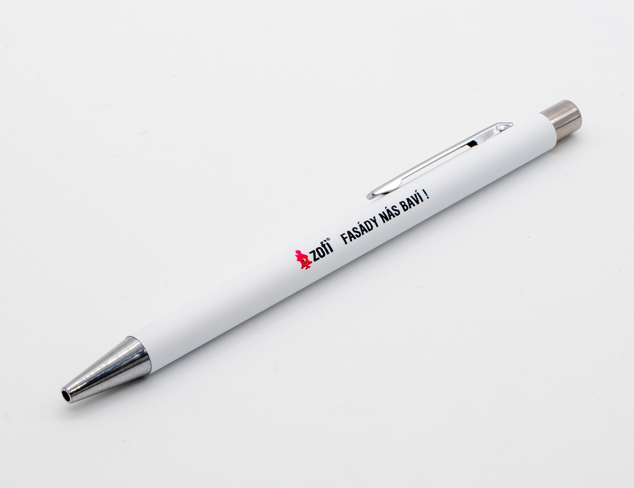 Styl, elegance a trochu nadsázky. Tahle kovová propiska ZOFI je tu pro všechny, kteří chtějí podepisovat dokumenty s noblesou a přitom nezapomenout, že fasády nás baví! Tělo v bílé barvě s kovovými detaily vypadá profi a kvalitní náplň píše modře a hladce.